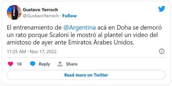 Según informó el periodista Gustavo Yarroch, el cuerpo técnico reunió al plantel para compartirle videos del amistoso de ayer ante Emiratos Árabes. El DT prefirió repasar algunos movimientos y detalles a ajustar con los futbolistas antes de saltar al campo de juego.
