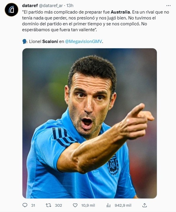 El entrenador campeón del mundo también destacó la actitud del conjunto oceánico en un encuentro que terminó cerrado y hasta pudo ser un empate si Dibu Martínez no se lucía sobre el final. “No esperábamos que fueran tan valientes”, resaltó sobre Australia. Un partido bisagra durante el último Mundial.