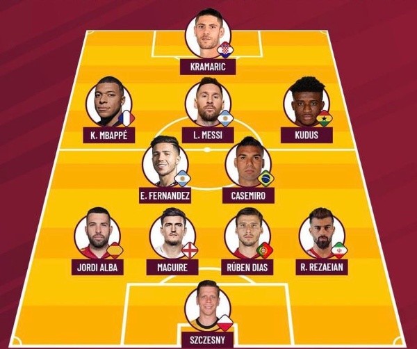 El equipo que conformó FIFA por el rendimiento en la segunda jornada del Mundial de Qatar, alineó con un esquema 4-2-3-1, y quienes conformaron al mismo fueron Szczęsny(Polonia);RaminRezaeian(Marruecos), Rúben Dias (Portugal), HarryMaguire(Inglaterra), Jordi Alba (España); Casemiro(Brasil), Fernández (Argentina),MohammedKudus(Ghana), Messi(Argentina),KylianMbappé(Francia);AndrejKramarić(Croacia).