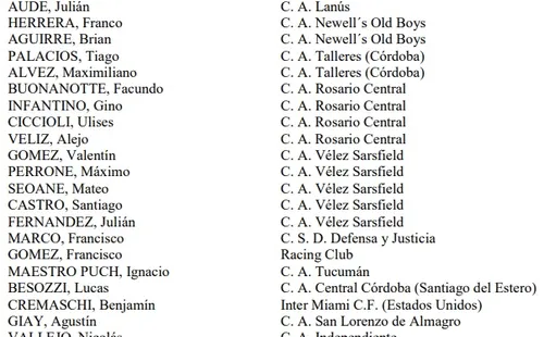 Quien si fue cedido por su club es Nicolás Paz, el mediocampista ofensivo del Real Madrid, que en los últimos días debutó con el primer equipo en un amistoso ante el Getafe. Además, el equipo contará con la presencia de Federico Gomes Gerth, el arquero de Tigre que fue el único sparring de la Selección en Qatar.