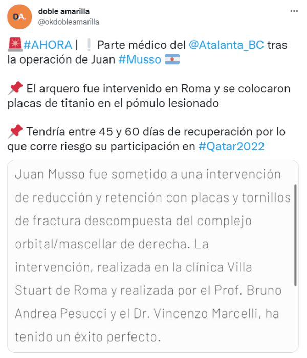 Según adelantóDoble Amarilla, a Mussose colocaron placas de titanio en el pómulo y el tiempo estimado de baja parte desde los 45 hasta los 60 días de rehabilitación, cuando quedan apenas dos meses para el inicio del Mundial. En el mejor de los casos, el arquero podrá volver a jugar a mediados de octubre y tendrá que luchar contra el tiempo para ganar el ritmo necesario para estar en Qatar. Mientras tanto, Rulli sigue sumando buenas actuaciones y Scaloni lo convocó para la gira por Estados Unidos.