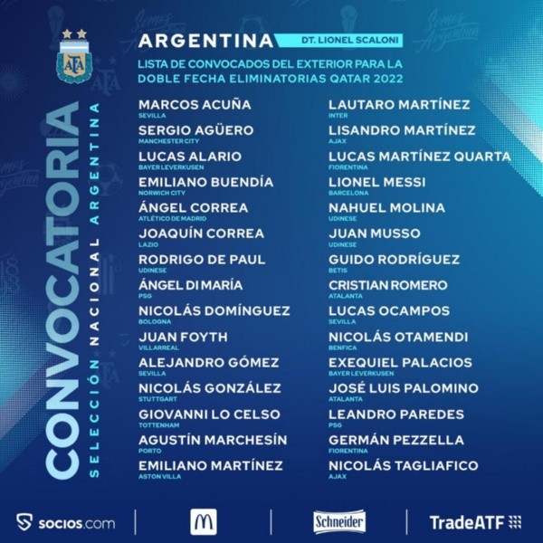 Entre las incorporaciones más llamativas se encuentran las deEmiliano Buendía, Nahuel Molina, Cristian Romero y José Luis Palomino Más allá de estar lesionados, aparecen tambiénExequiel Palacios, Lucas Alario, Juan Foyth y Nico González, quien está regresando de a poco a las canchas. tras estar parado por un largo tiempo.