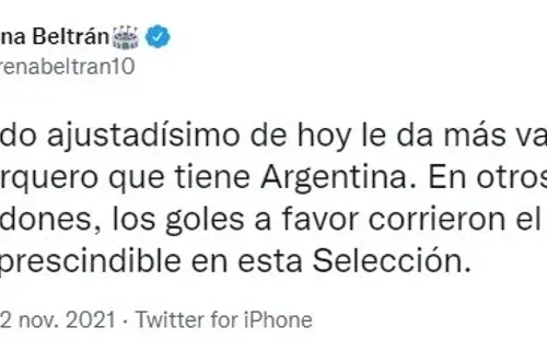 Finalmente, otro de los destacados por la joven periodista fue Marcos Acuña, sobre quien escribió: “Huevo Acuña nunca te deja a gamba. Qué potencia y qué determinación. Clausuró la banda izquierda y cuando pasó, no lo pudieron tumbar nunca con pelota. Jugadorazo”.