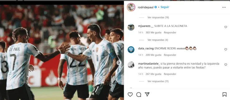 “¡Representar al país es esto, mentalidad, orgullo y sentido de pertenencia! Este equipo demostró que no se relaja y siempre quiere más. VAMOS ARGENTINA”, publicó Rodrigo De Paul en su cuenta de Instagram. Varios hinchas aprovecharon para festejar, pero sus compañeros de equipo también se hicieron notar con varias acotaciones graciosas.