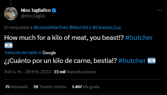 “How much for a kilo of meat, you beast!?” (¿¡Cuánto por un kilo de carne, bestia!?), escribió Taglia junto con un #Butcher para terminar de aclarar a lo que se refería respecto al apodo de carnicero. Lógicamente, esto no tardó en viralizarse y hacer estallar de la risa a todos los usuarios de la red social del pajarito.