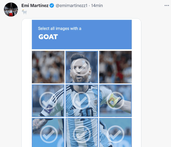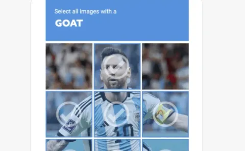 En la foto central se lo puede ver a Messi, pero con una leyenda en inglés: “Select all images with a GOAT”, que en su traducción al castellano significa “seleccione todas las imágenes con una cabra”. Pero más allá de que en cualquier tipo de diccionario la palabra goat se traduzca para mencionar al animal, en el 10 tiene otro sentido.