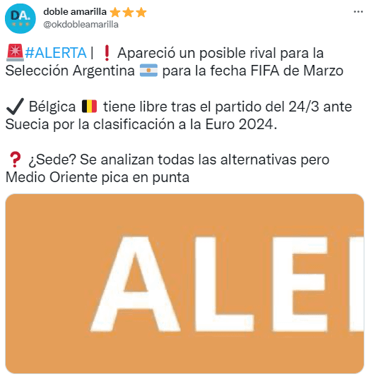 El portalDoble Amarilladio a conocer la noticia: “Apareció un posible rival para Argentina: Bélgicatiene libre tras el partido del 24 de marzo ante Suecia por la clasificación a la Euro 2024”. De ponerse de acuerdo entre las federaciones, habrá un encuentro de alto vuelo en la fecha FIFA más inmediata.