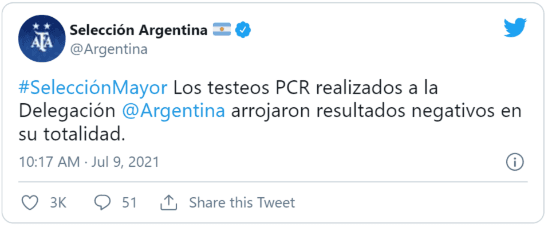 Más allá del gran esfuerzo, lo más importante de todo iban a ser los resultados de los hisopados realizados ayer, ya que cualquier caso detectable en un jugador lo iba a dejar afuera de la final. Esta mañana, la Selección comunicó el parte médico.