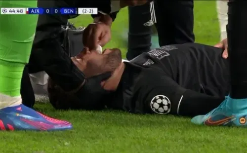 Después de un centro al área, el capitán de Benfica y emblema de la Albiceleste, fue a buscar el cabezazo pero se topó con la humanidad de los futbolistasAndré Onana y Jurrien Timber, con quienes chocó y quedó tendido en el suelo.