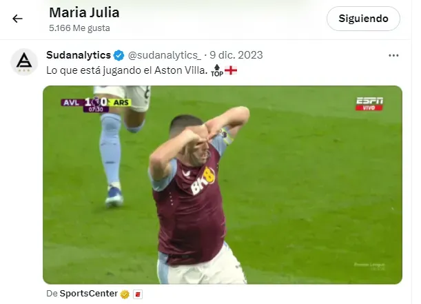 Mediante su cuenta de Twitter, María Julia Silva, esposa de Marcos Acuña, ya lanzó una primera señal al Aston Villa. Fue con una serie de likes a diferentes publicaciones relacionadas con el conjunto inglés. Una de ellas, en referencia con el buen andar del equipo en la primera rueda de la Premier League, en la que logró ubicarse segundo en la tabla de posiciones con 13 victorias, tres empates y solo 4 derrotas.