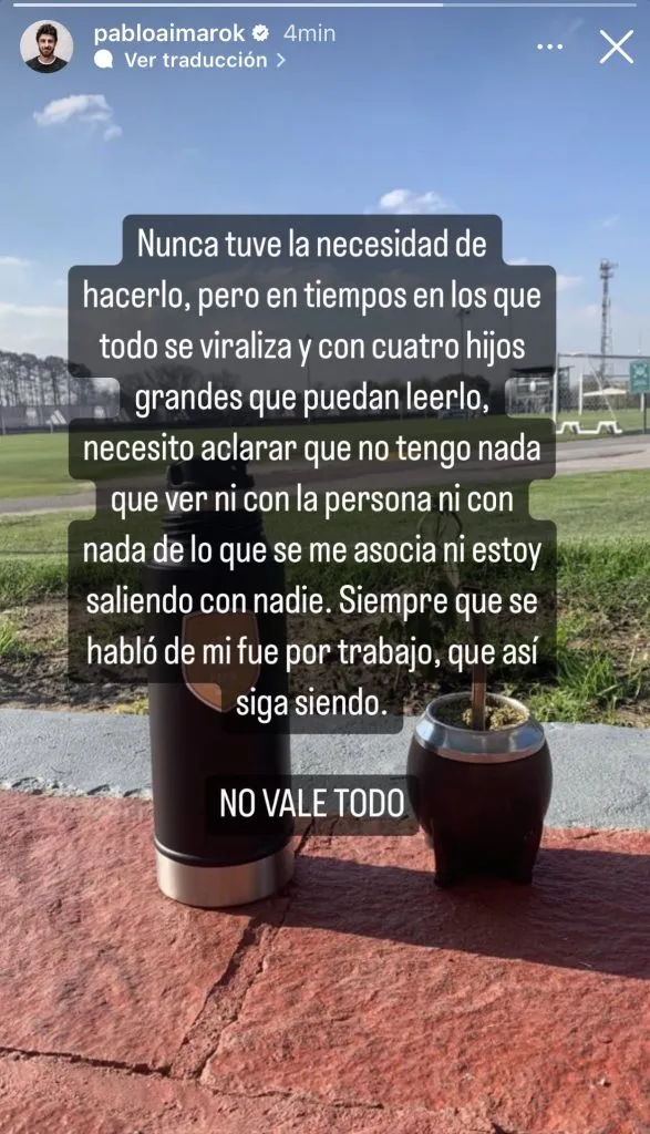 Después del enorme revuelo que se armó, fue el propio Pablo Aimar quien rompió el silencio y desmintió la vinculación: “Nunca tuve la necesidad de hacerlo, pero en tiempos en los que todo se viraliza y con cuatro hijos que pueden leerlo, necesito aclarar que no tengo nada que ver ni con la persona ni con nada de lo que se me asocia ni estoy saliendo con nadie. Siempre que se habló de mi fue por trabajo, que así siga siendo. No vale todo”, escribió por medio de un posteo en su cuenta de Instagram.