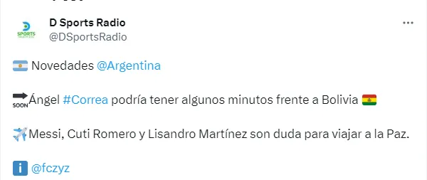 Acorde a lo informado por el periodista Fernando Czyz de D Sports Radio, Ángel Correa podría tener algunos minutos frente a Bolivia, por lo que corre con chances de jugar en el lugar de Messi, en caso de que no llegue en óptimas condiciones.