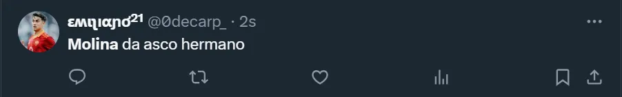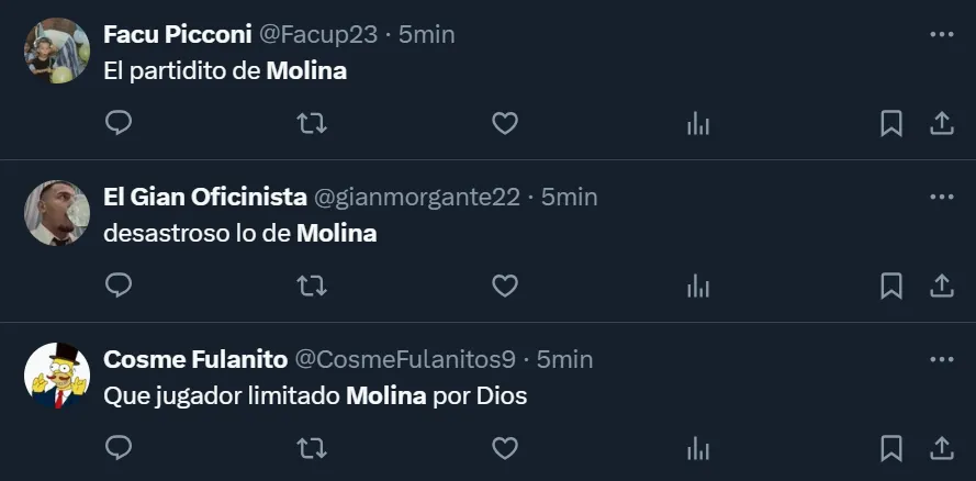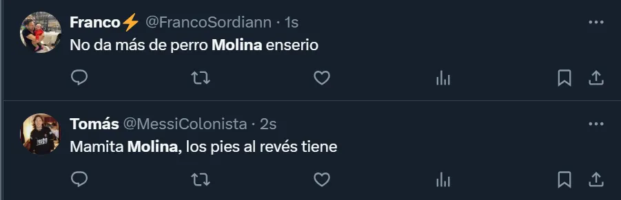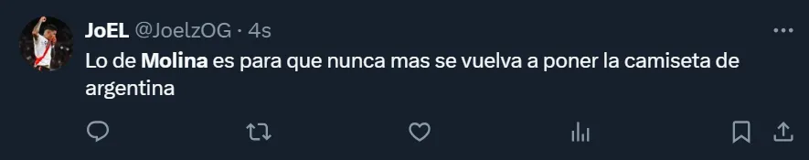 “Lo de Molina es para que nunca más se vuelva a poner la camiseta de Argentina”, esbozó uno de los tantos fanáticos en X (ex Twitter), donde el ex futbolista de Boca Juniors terminó siendo tendencia por su nivel. “Mamita Molina, los pies al revés tiene”, fue otro de los comentarios que se vio en la ex red social del pajarito respecto a la actuación del cordobés.
