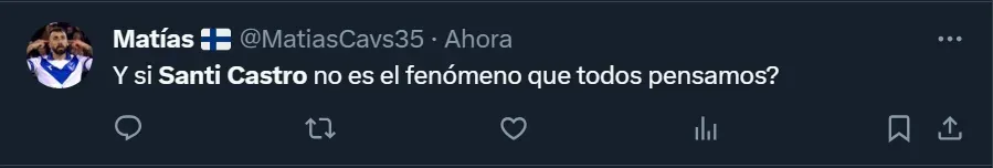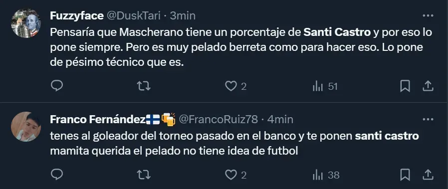 Las tribunas virtuales arrasaron con las críticas para con el entrenador nacional y también contra Castro. De hecho, hubo quienes acusaron al DT de poseer un porcentaje de la ficha del atacante, algo que llamó poderosamente la atención en las redes sociales. “Pensaría que Mascherano tiene un porcentaje de Santi Castro y por eso lo pone siempre. Pero es muy pelado berreta como para hacer eso. Lo pone de pésimo técnico que es”, aseguró el usuario @DuskTari en X, la app que antiguamente era conocida como Twitter.