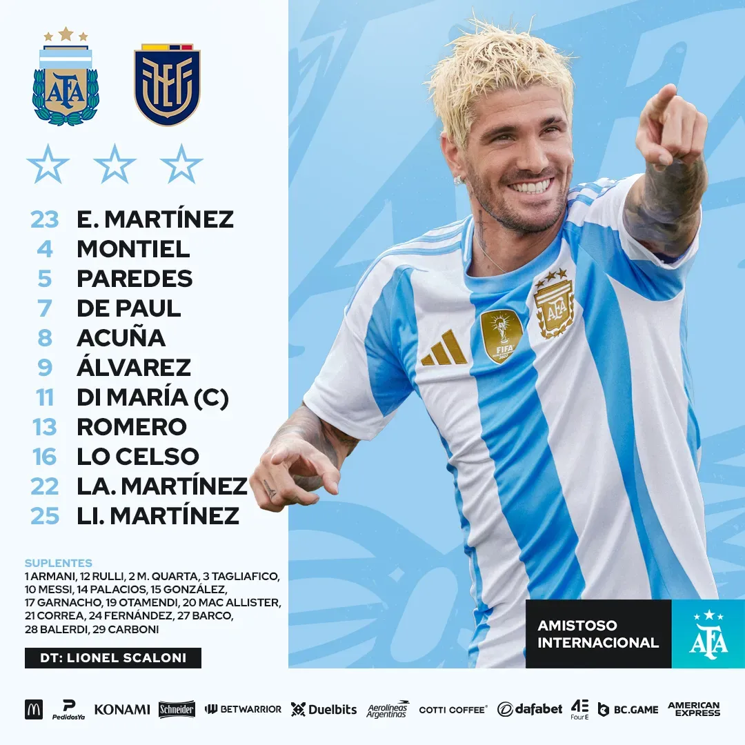 Sin Lionel Messi, el equipo de Scaloni saldría a la cancha con: Emiliano Martínez; Gonzalo Montiel, Cristian Romero, Lisandro Martínez, Marcos Acuña; Rodrigo De Paul, Leandro Paredes, Giovani Lo Celso, Julián Álvarez; Ángel Di María y Lautaro Martínez.