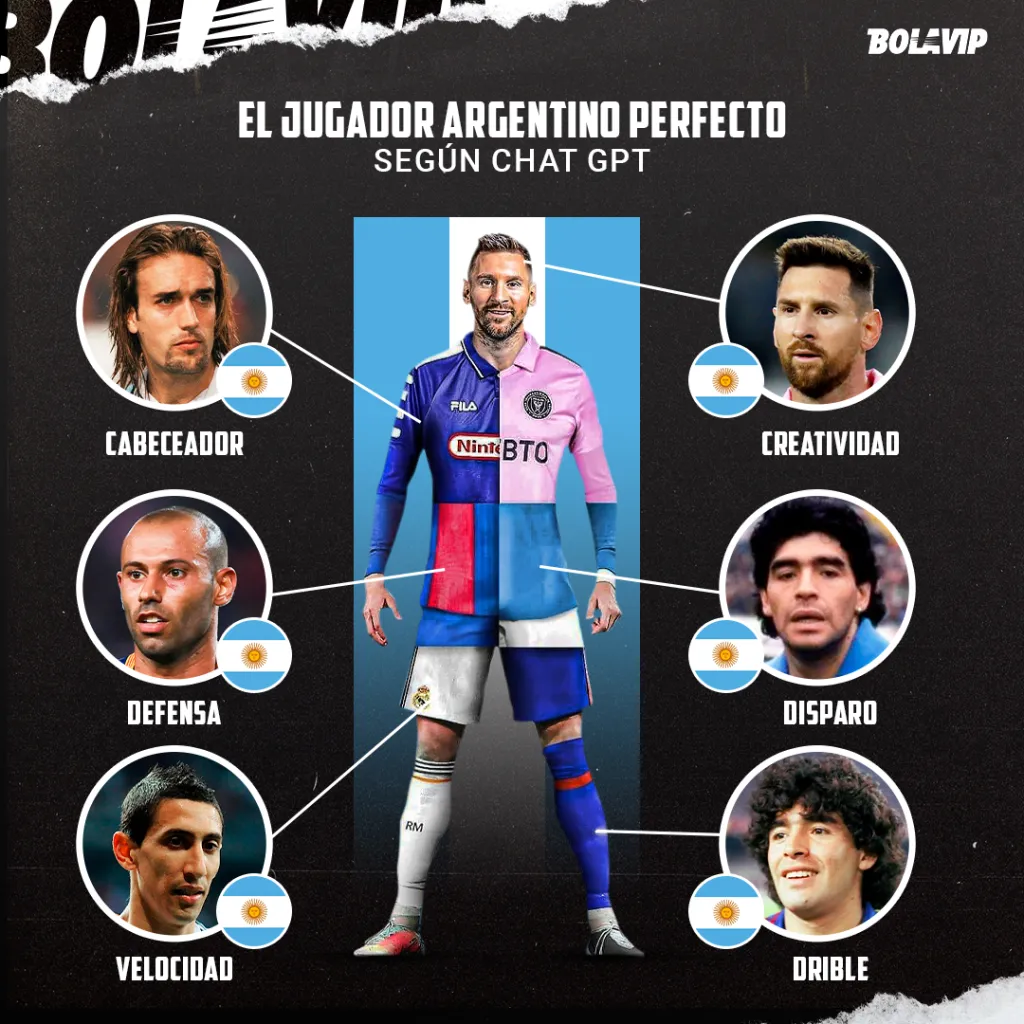 Según pudo elaborar el Chat GPT ante la consulta de como sería el jugador perfecto, se puede observar como el mismo tendría cosas de Messi, Maradona, Batistuta, Mascherano y Ángel Di Maríapara poder destacarse entre todos los demás.