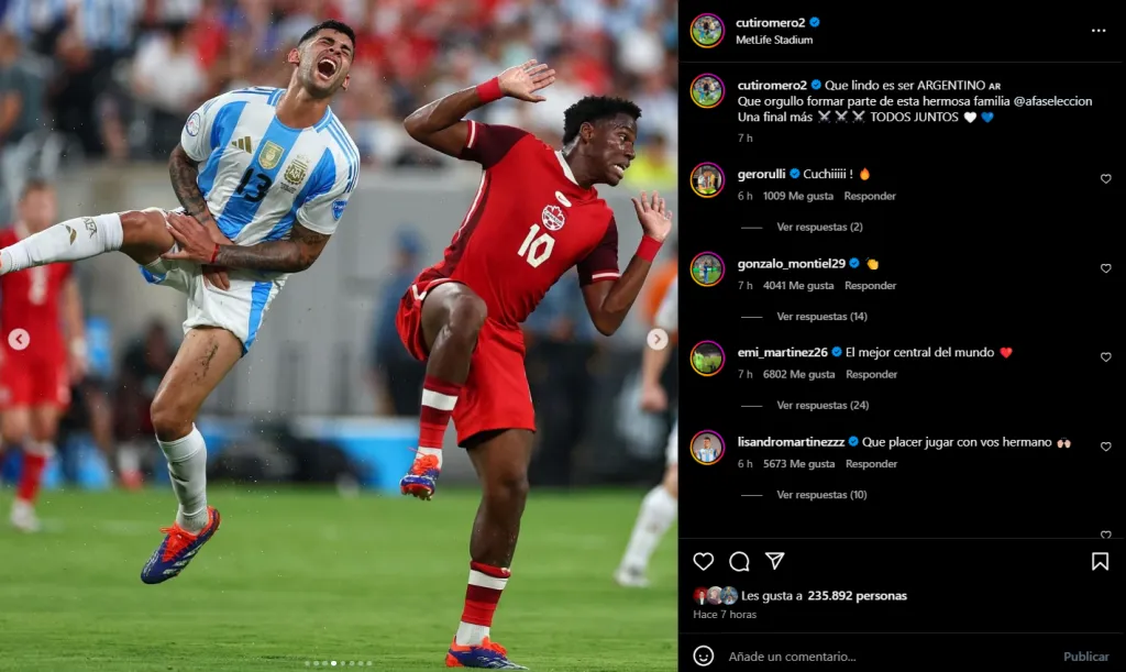 A través de su cuenta oficial de Instagram, Cristian Romero se mostró feliz por estar a las puertas de un nuevo título con la Selección: “Que lindo es ser ARGENTINO. Que orgullo formar parte de esta hermosa familia. Una final más. TODOS JUNTOS“.