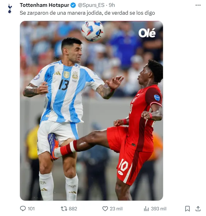 El delantero canadiense impactó con los tapones sobre el muslo derecho del defensor, que quedó muy dolorido. Minutos después de ese suceso, quien se pronunció al respecto fue el Tottenham, club dueño de su pase, que quiere que el cordobés vuelva sano a Londres.