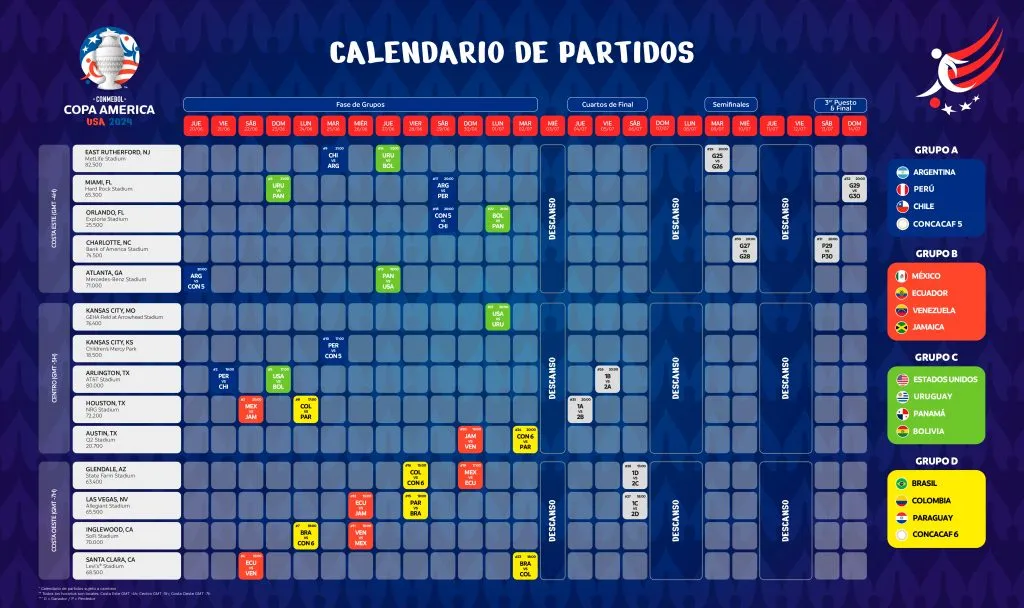 La segunda fecha Argentina la tendrá ante Chile, el 25 de junio en el MetLife Stadium, Nueva Jersey; mientras que el cierre de la fase de grupos será ante Perú, el 29 de junio en el Hard Rock Stadium, en Miami.