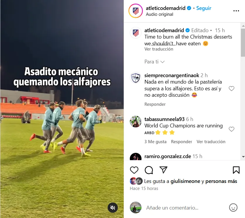 Pero eso no es todo. Ahora, bajo el marco del retorno a la capital española de los jugadores sudamericanos tras la celebración de la Navidad, sumaron una nueva. ”Asadito mecánico quemando los alfajores”, se lee sobre un video en el que están Ángel Correa, Nahuel Molina, Julián Álvarez, Rodrigo De Paul y Giuliano Simeone en su primer entrenamiento post brindis del 24 a la noche.