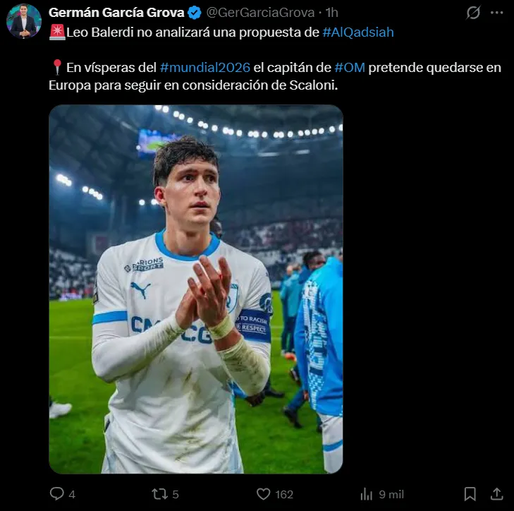 Por todo ello es que Balerdi no tiene intenciones siquiera de sentarse a evaluar una oferta que, según trascendió, estaban preparando en Al-Qadsiah de Arabia Saudita para lanzarse por su fichaje en el mercado de pases de mitad de temporada. Según avanzó el periodista Germán García Grova en X, el defensor “pretende quedarse en Europa para seguir en la consideración de Scaloni” en la recta final del camino rumbo a la Copa del Mundo que se disputará con Estados Unidos, México y Canadá como sedes.