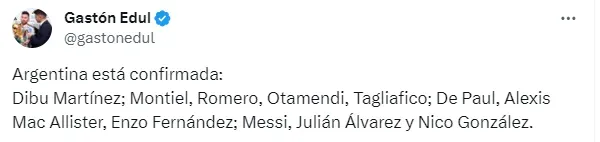 Emiliano Martínez; Gonzalo Montiel, Cristian Romero, Nicolás Otamendi, Nicolás Tagliafico; Rodrigo De Paul, Enzo Fernández, Alexis Mac Allister; Nicolás González, Lionel Messi y Julián Álvarez.