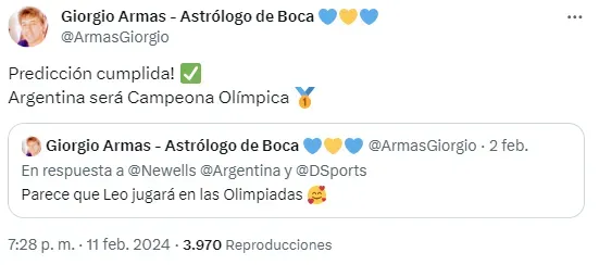 En medio de los rumores, Giorgio Armas, el famoso astrólogo, predijo cómo le irá al combinado argentino en la cita olímpica, que inicia el 26 de julio. “Argentina será campeona olímpica“, lanzó en su cuenta de X tras haberse regodeado por haber pegado el vaticinio sobre la clasificación del equipo.