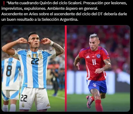 La cuenta además detalló por qué Argentina es el favorito para el duelo ante Chile: “Marte cuadrando Quirón del ciclo Scaloni. Precaución por lesiones, imprevistos, expulsiones. Ambiente áspero en general. Ascendente en Aries sobre el ascendente del ciclo del DT debería darle un buen resultado a la Selección Argentina“.