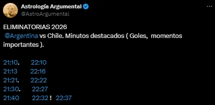 A pesar de esta incidencia, la cuenta de X Astrología Argumental predijo que será un encuentro favorable para los bicampeones de América. Como es habitual, compartió no de lado están los astros esta noche, sino también en qué momentos de la velada habrá acciones cruciales.