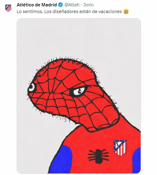 Jugando con el apodo del ex River, Atlético de Madrid presentó a Julián Álvarez con una publicación en la que se ve un dibujo del Hombre Araña bastante desmejorado con el escudo del club. ”Lo sentimos. Los diseñadores están de vacaciones”, fue la descripción con un claro tinte de ironía. De esta manera, un tanto particular, el Colchonero confirmó el arribo del atacante argentino.