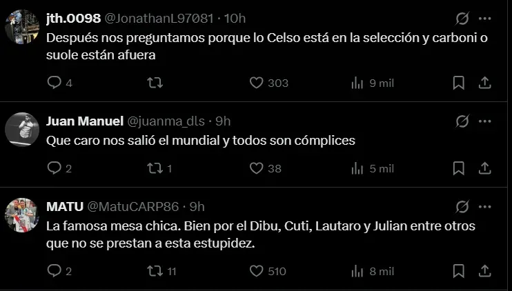 “Que caro nos salió el Mundial y todos son cómplices”, “La Selección y Chiqui Tapia festejando mientras se roban el fútbol argentino”, “El grupito de Messi del 2018 volvió y ahora es cómplice de AFA”, “Este tipo es el peor mal del fútbol argentino”, “Los privilegios que tiene ese grupo”, fueron algunas de las críticas para los jugadores y Tapia.