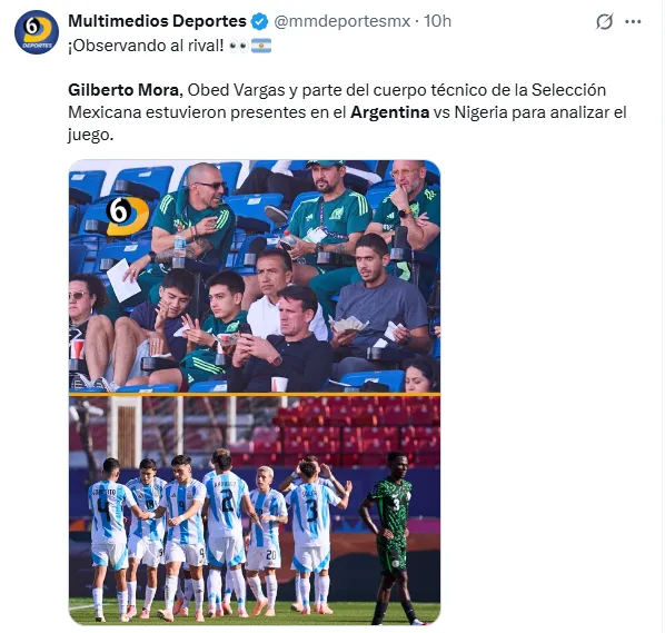 Incluso, esto le dio la posibilidad a Gilberto Mora, figura del seleccionado mexicano, y a otros miembros del plantel, de observar y analizar desde una de las plateas del recinto ubicado en la capital chilena, principalmente, a Argentina, que empezó ganando su duelo con Nigeria desde el minuto de juego.