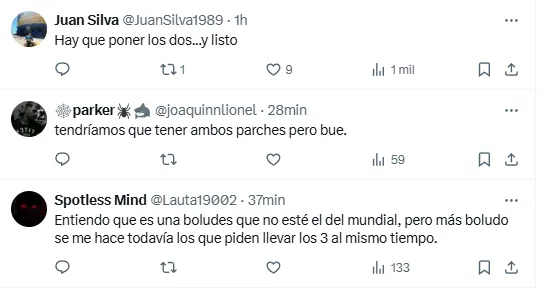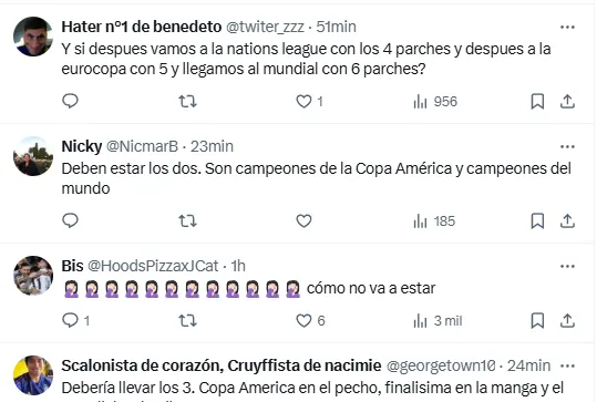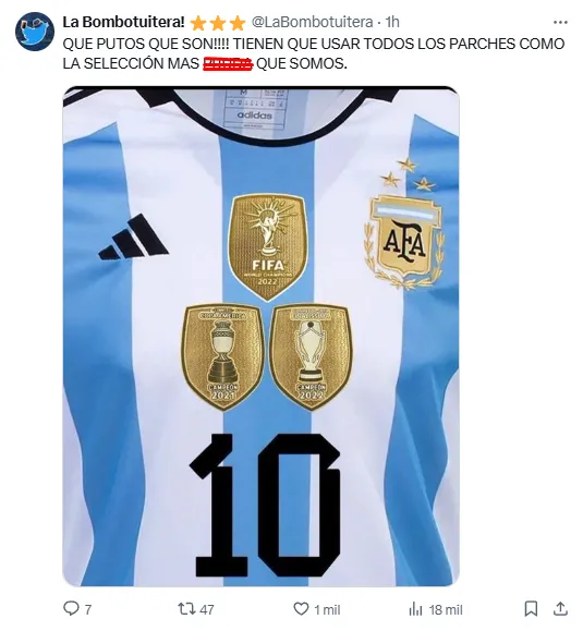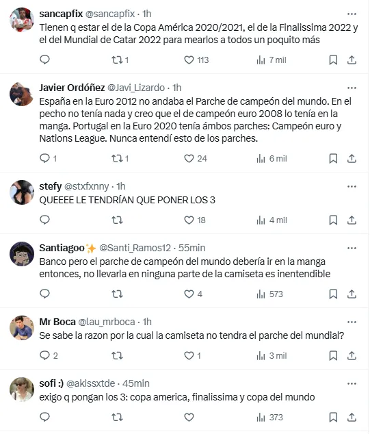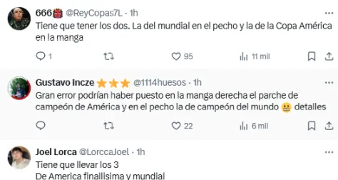 El detalle del nuevo parche llamó la atención y generó opiniones divididas, ya que se reclamó la presencia del logo de campeón del mundo de la FIFA además del escudo por ser vigente ganador de la Copa América. Incluso no faltaron pedidos para agregar el parche de la Finalissima ganada ante Italia en Wembley.