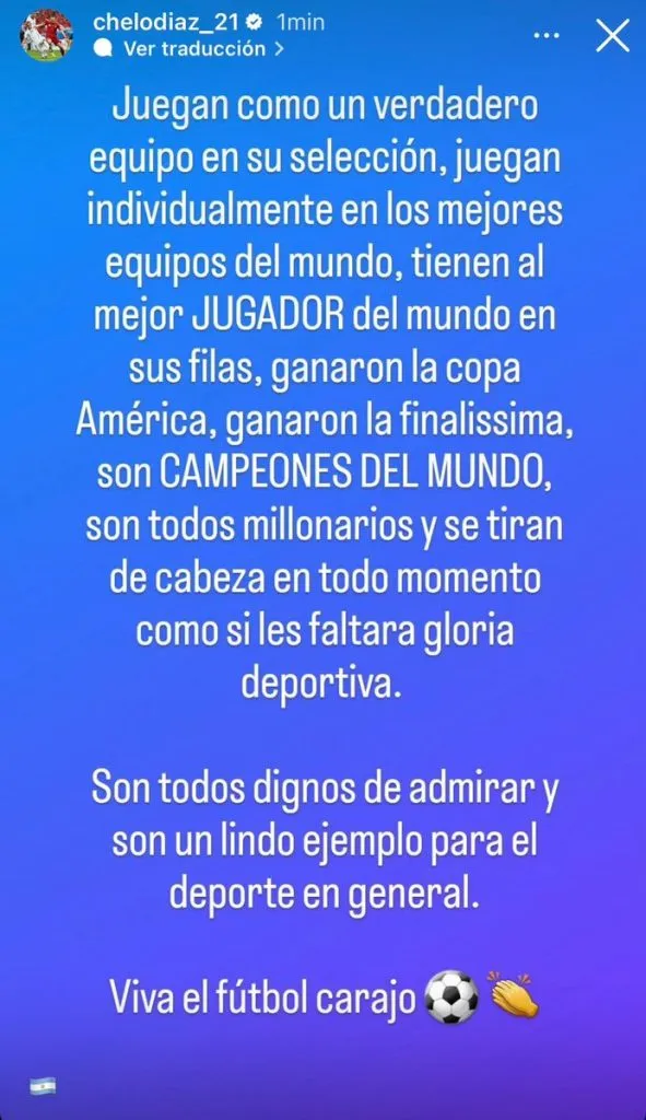 “Juegan como un verdadero equipo en su selección, juegan individualmente en los mejores equipos del mundo, tienen al mejor jugador del mundo en sus filas, ganaron la Copa América, ganaron la Finalissima, son campeones del mundo, son todos millonarios y se tiran de cabeza en todo momento como si les faltara gloria deportiva”, comenzó expresando Díaz.