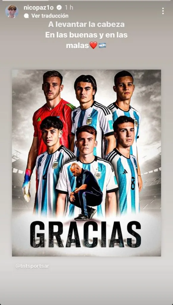 Una vez que finalizó el encuentro, Nico Paz, mediocampista que estuvo en el Sudamericano Sub 20, pero que no pudo estar para el Mundial debido a la negativa del Real Madrid, les dedicó un posteo a sus compañeros en su cuenta de Instagram.