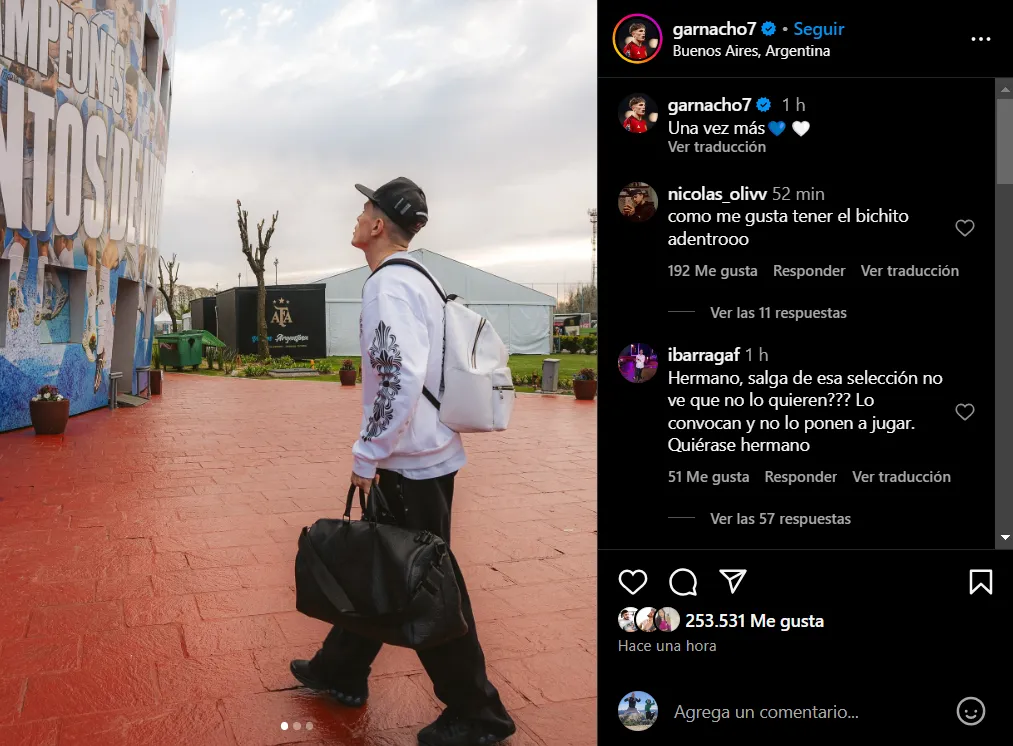 “Una vez más”, enfatizó Garnacho por intermedio de su cuenta oficial de Instagram, acompañando dicha frase con una serie de fotografías desembarcando en el Predio Deportivo Lionel Andrés Messi que posee la Asociación del Fútbol Argentino en Ezeiza.