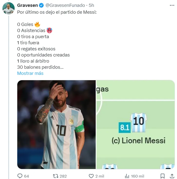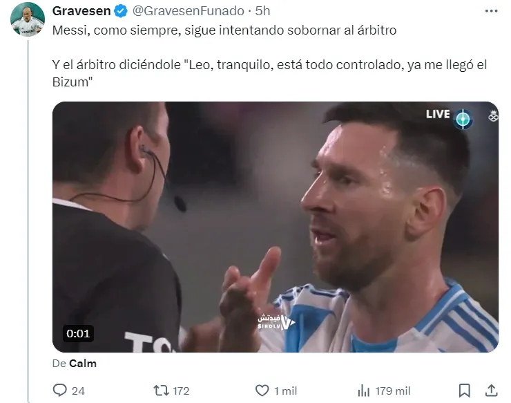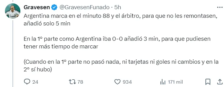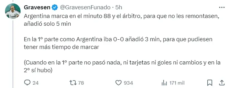 Lo más viral de la jornada fue de la autoría de un usuario español. A través de su cuenta de X, armó un hilo reuniendo polémicas, asegurando que la victoria albiceleste “fue un robo“. Por supuesto, los hinchas argentinos salieron rápido al cruce, algunos tomándolo con gracia y otros no tanto.