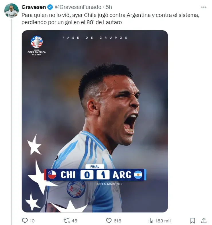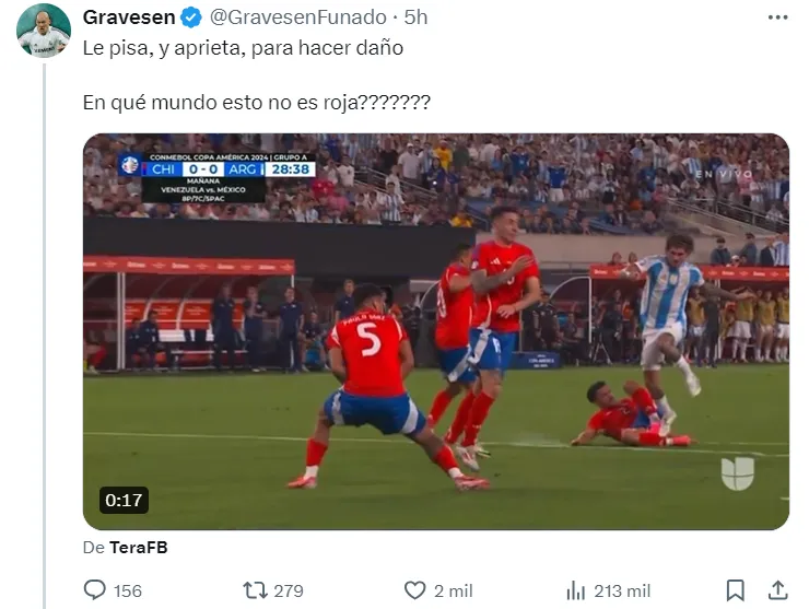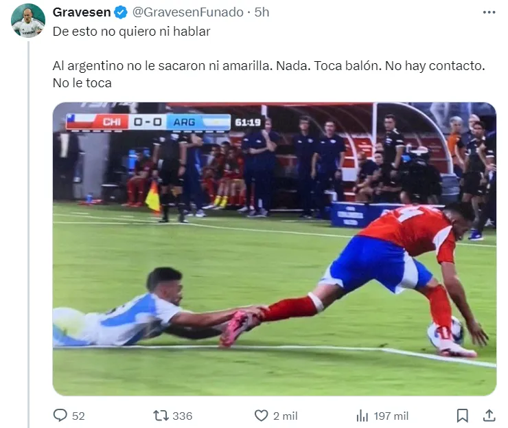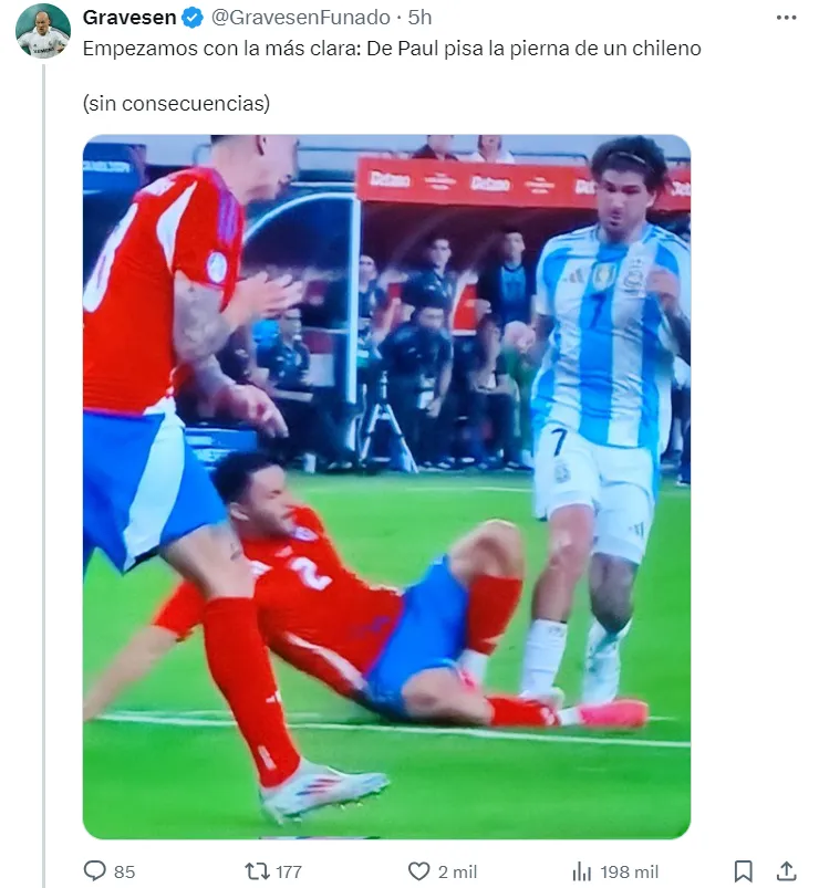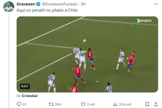 “Hilo con todos los robos de ayer de Argentina“, comenzó posteando el simpatizante, alcanzando millones de interacciones en horas. Y continuó: “Para quien no lo vió, ayer Chile jugó contra Argentina y contra el sistema, perdiendo por un gol en el 88′ de Lautaro“.