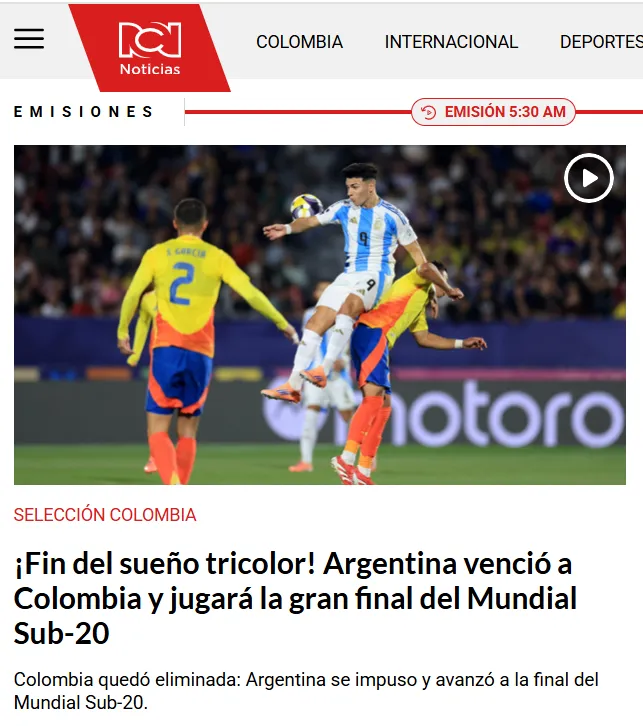 RCN Noticias: ”¡Fin del sueño tricolor! Argentina venció a Colombia y jugará la gran final del Mundial Sub-20. Por más intentos y dominio que mostró durante gran parte del encuentro, la Selección Colombia Sub-20 no logró concretar sus opciones y terminó cayendo 1-0 ante una ordenada Argentina, que vuelve a demostrar su jerarquía en las instancias decisivas”.