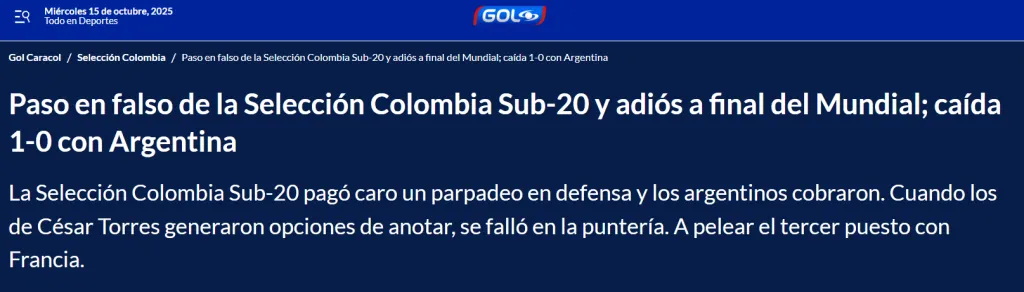 El Colombiano: ”Se acabó la ilusión: Argentina venció a Colombia y jugará la final contra Marruecos. La Selección Colombia se despidió de la lucha por el título del Mundial Sub-20 2025 al perder 1-0 ante Argentina en la semifinal disputada en Santiago de Chile. El encuentro se definió con un tanto de Mateo Silvetti al minuto 72”.
