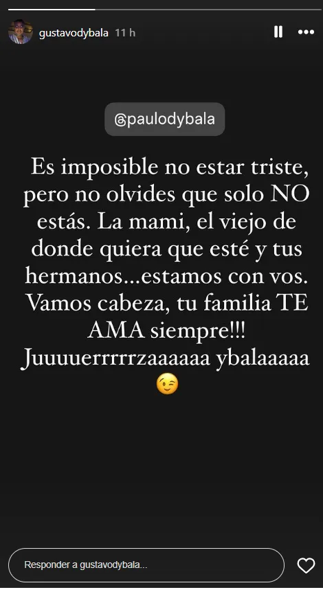 El mayor de los tres Dybala se pronunció en sus redes con un mensaje de apoyo para el crack de la Roma: “Es imposible no estar triste, pero no olvides que solo no estás. La mami, el viejo de donde quiera que esté y tus hermanos estamos con vos“, escribió.