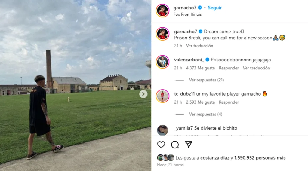 “El sueño se hizo realidad. Prison Break, puedes llamarme para una nueva temporada”, escribió Garnacho para acompañar una serie de fotos desde el Centro Correccional de Joliet, donde se grabó la primera de las cinco temporadas de la serie estadounidense de la que demostró ser un gran fanático.