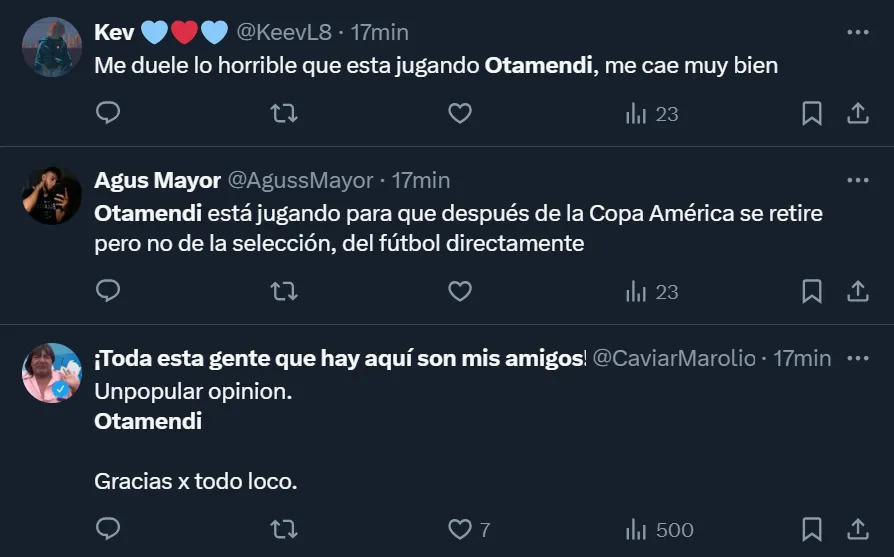 Mas allá de que el ex Vélez Sarsfield tuvo 5 intercepciones por sobre sus rivales, solamente ganó 1 de los 3 duelos terrestres que disputó, pero tuvo el 100% de efectividad en duelos aéreos con los 3 que afrontó. Además, perdió 5 veces la posesión del balón y cometió 2 infracciones. Y el usuario de Twitter @AgussMayor fue uno de los tantos que hostigó al futbolista: “Otamendi está jugando para que después de la Copa América se retire pero no de la selección, del fútbol directamente”, esbozó.
