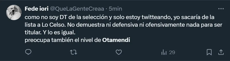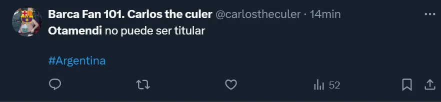 Si bien el seleccionado argentino no tuvo que sufrir para ganarle a los guatemaltecos, los hinchas analizaron el desarrollo individual y grupal de los jugadores, donde cuestionaron la actuación de Nicolás Otamendi, quien no tuvo una noche de ensueño. El rendimiento del defensor de Benfica no fue de los que habitualmente acostumbra, y la crítica popular no se hizo esperar.