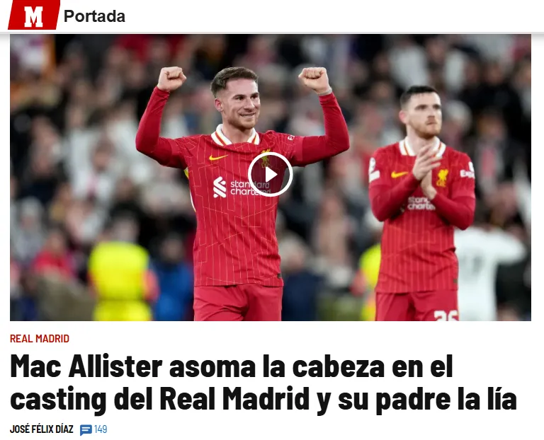 El nombre que asoma en el Merengue es del 10 del Liverpool. Así de claro lo apunta el diario Marca este domingo 13 de abril. Pero lo curioso no es la noticia en sí, la cual se percibe de manera muy directa, sino la crítica en su portada principal a Carlos Javier Mac Allister, ex Argentinos Juniors, Boca, Racing y Ferro y también padre del campeón del mundo en Qatar 2022.