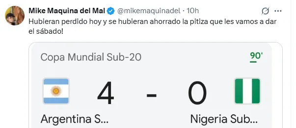 Con lo cual, en el país norteamericano se ve como una posibilidad para tomarse revancha de los disgustos que vienen sumando en los últimos años. ”Hubiera perdido hoy y se ahorraban la pitiza (paliza) que les vamos a dar el sábado”, escribió el youtuber Mike Maquina del Mal, que enseguida sumó adeptos que se desparramaron por diferentes plataformas