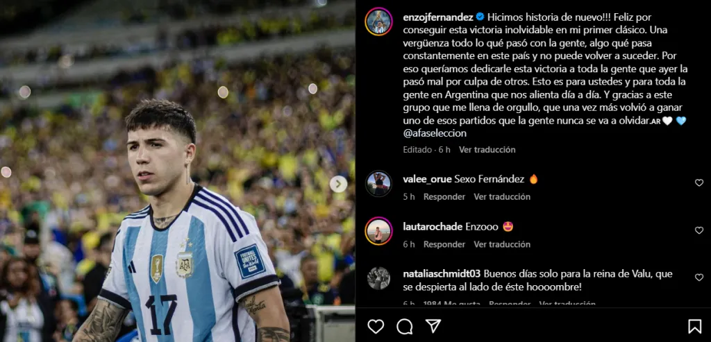 “Hicimos historia de nuevo!!! Feliz por conseguir esta victoria inolvidable en mi primer clásico. Una vergüenza todo lo que pasó con la gente, algo que pasa constantemente en este país y no puede volver a suceder. Por eso queríamos dedicarle esta victoria a toda la gente que ayer la pasó mal por culpa de otros”, comenzó exteriorizando Enzo Fernández.