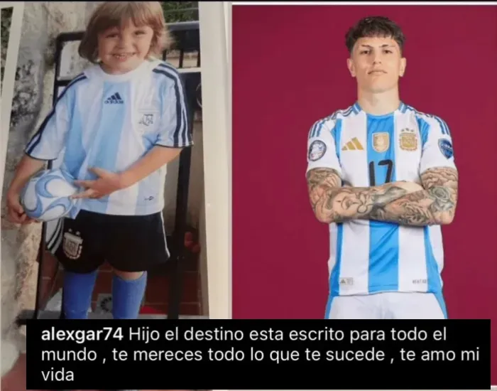 Alex Garnacho vio las imágenes institucionales de su hijo con la camiseta del campeón del mundo y no ocultó su emoción. A través de su cuenta de Instagram, compartió la foto actual junto con una de cuando era niño y lucía los mismos colores que ahora.