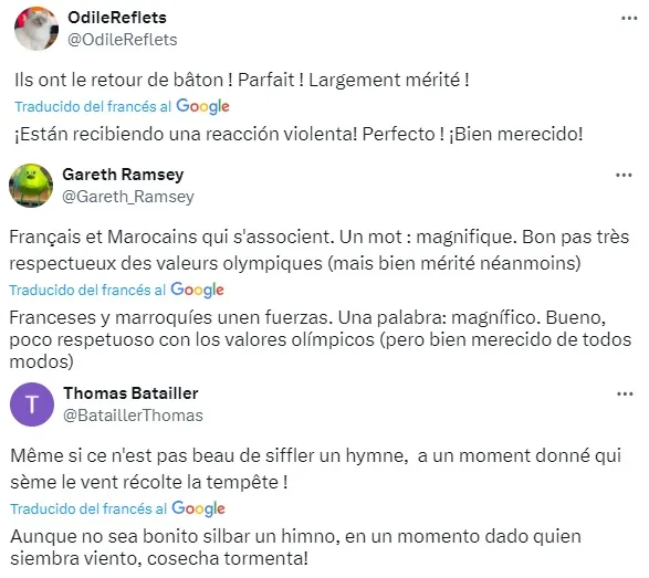 ”Franceses y marroquíes unen fuerzas. Una palabra: magnífico. Bueno, poco respetuoso con los valores olímpicos, pero bien merecido de todos modos”, es uno de los comentarios que hacen referencia al hostigamiento que padecieron los jugadores del elenco que comanda Javier Mascherano. Pero, claramente, no fue el único, otro de los usuario apuntó: ”están recibiendo una reacción violenta. ¡Perfecto! Merecido”.