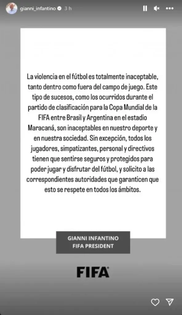 “La violencia en el fútbol es totalmente inaceptable, tanto dentro como fuera del campo de juego. Este tipo de sucesos, como los ocurridos durante el partido de clasificación para la Copa Mundial de la Fifa entre Brasil y Argentina en el estadio Maracaná, son inaceptables en nuestro deporte y en nuestra sociedad“, comenzó el presidente de la FIFA.
